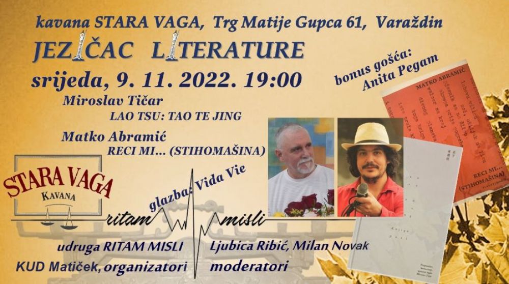 Dragi knjigoljupci, Ritam misli nastavlja u ritmu mjeseca u kojem caruje knjiga. Poziva vas na Jezičac literature koji će se održati 9. 11. 2022. s početkom u 19:01 na starom mjestu, u kavani Stara vaga, Trg Matije Gupca 61, Varaždin.
