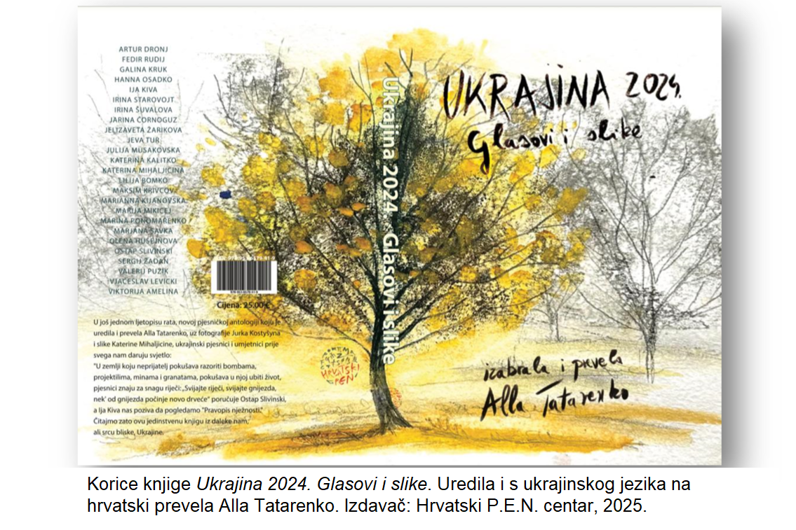 Nova knjiga Ukrajina 2024. Glasovi i slike u izdanju Hrvatskog P.E.N. centra izvanredno je pjesničko svjedočanstvo o više od tisuću dana i noći otpora ukrajinskog naroda protiv ruske agresije. Ova antologija, koju je s ukrajinskoga prevela i uredila Alla Tatarenko, okuplja glasove dvadeset i petero suvremenih ukrajinskih pjesnikinja i pjesnika svih generacija, od najpoznatijih do novih imena. Među njima su Galina Kruk, Ostap Slivinski, Ija Kiva, Katerina Mihaljicina, Artur Dronj, Viktorija Amelina, Marjana Savka, Maksim Krivcov i drugi. Neki od njih bili su gosti festivala Stih u regiji na kojem je predstavljena ova nova knjiga, a gostovala je i urednica i prevoditeljica Alla Tatarenko.
