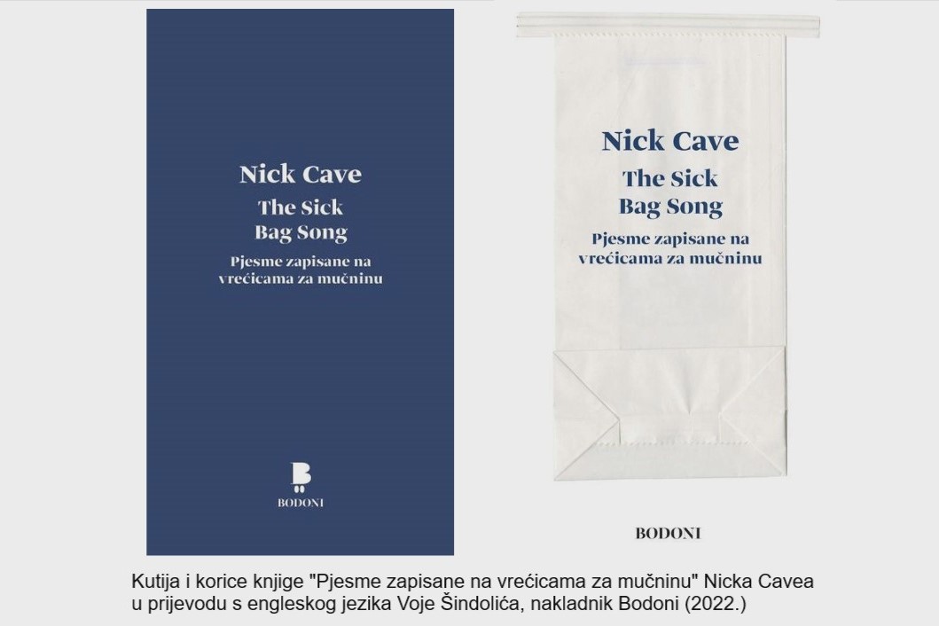 Da poezija pokatkad nastaje na krajnje neobičnim mjestima ili bude zapisana na neobičan način pokazuje knjiga „Pjesme zapisane na vrećicama za mučninu“ Nicka Cavea, karizmatičnog frontmena jedne od najdugovječnijih rock skupina The Bad Seeds. Knjigu izvornog naslova „The sick bag song“ objavljenu 2015. godine, kod nas je objavio nakladnik Bodoni 2022., a u prijevodu uglednog prevoditelja s engleskog jezika Voje Šindolića kojemu možemo zahvaliti užitak čitanja beat poezije na hrvatskom jeziku. Vezano za Caveovu knjigu, u jednom je intervjuu istaknuo da pouzdano zna da Cave samoga sebe više vidi kao književnika nego glazbenika.
