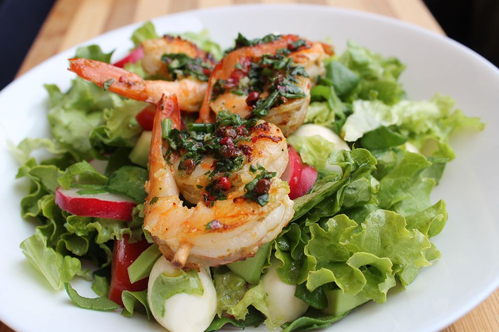 Kozice očistiti od ljuštura, nabosti po 5 kom na štapić i naglo, vrlo kratko prepeći na gril tavi. U međuvremenu u mužaru usitniti češnjak, limunovu koricu, papar u zrnu, peršin i sol sa maslinovim uljem. Marinadom preliti kozice i staviti sa strane.