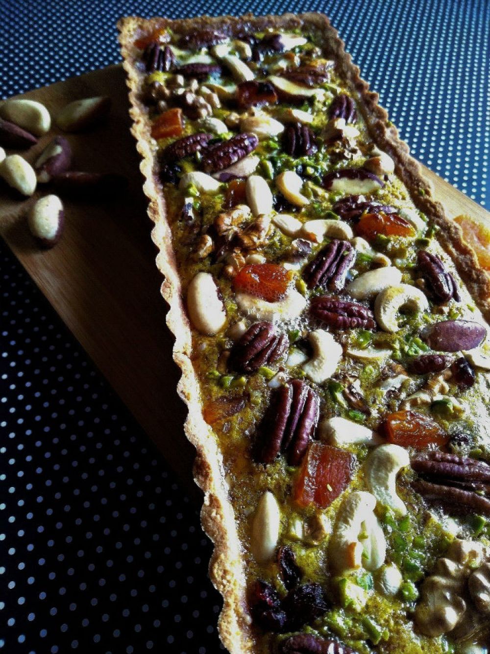 Poznato je da su orašasti plodovi prepuni zdravih omega-3 masnoća, nutrijenata i napose minerala koji imaju važnu ulogu u sprječavanju kardiovaskularnih bolesti i bolesti srca. Isto tako nije zanemariv značaj orašastih plodova pri snižavanju kolesterola, ali ipak valja pripaziti sa količinom jer su izuzetno kalorični. No, pustimo analize i procjene prehrambene vrijednosti nutricionistima i drugim stručnjacima koji poznaju tu tematiku. Ovo je ipak blog namijenjen onima koji vole finu hranu konzumirati, a i pripremati, poput mene. Dakle, ovaj tart je vrlo jednostavan za pripremu, mekan, kremast i hrskav istodobno, ne presladak. Ja ću navesti sve vrste orašastih plodova koje sam upotrijebila, a vi ih prilagodite svojim mogućnostima i afinitetima.