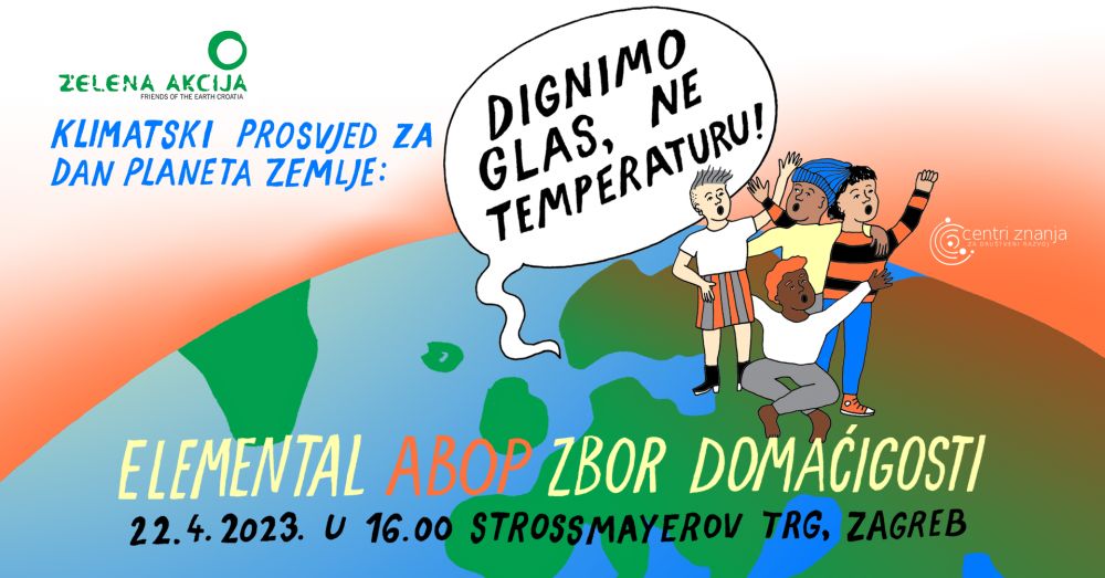 Zelena akcija vas poziva na klimatski prosvjed koji će se održati na Dan planeta Zemlje, 22. travnja, u 16.00 na Strossmayerovom trgu u Zagrebu. Glavni slogan prosvjeda jest “Dignimo glas, ne temperaturu!”.