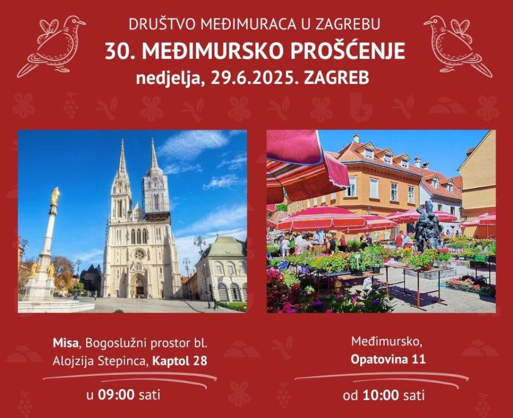 Društvo Međimuraca u Zagrebu, u nedjelju 29. lipnja 2025. organizira 30. Međimursko prošćenje, tradicionalno okupljanje Međimuraca, njihovih prijatelja i svih ljubitelja međimurske kulturne i gastronomske baštine.