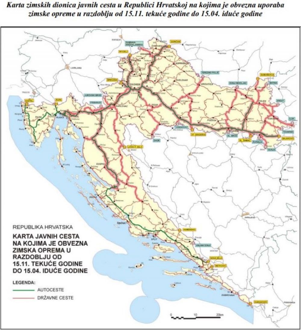 Od 15. studenog ove godine do 15. travnja sljedeće obvezna je uporaba zimske opreme na svim vrstama motornih vozila, osim vozila oružanih snaga Republike Hrvatske. Spremne su i zimske službe, iako barem zasad u Hrvatskoj,zbog visokih dnevnih temperatura još nema većih smrzavanja kolnika. Obveza uporabe zimske opreme od četvrtka, 15. studenoga, međutim vrijedi bez obzira na vremenske uvjete i stanje kolnika, i to na zimskim dionicama javnih cesta, u koje se ubraja 839,2 km autocesta, 1523,3 km državnih i županijskih cesta te 68,1 km državnih cesta za tranzitni promet iz trajektnih luka Vukovar, Osijek, odnosno luke i rafinerije Sisak.Zimska oprema za motorna vozila lakša od 3,5 tone mogu biti četiri zimske gume ili četiri ljetne gume, čija je dubina profila najmanje 4 milimetra, s lancima za snijeg na pogonskim kotačima.Za autobuse, to su lanci za snijeg na pogonskim kotačima ili zimske gume na pogonskim kotačima.Vozači koji se na cesti zateknu bez propisane opreme mogu dobiti novčanu kaznu u visini od 700 kuna.