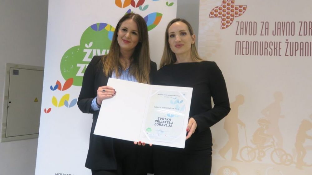 Dinka Nakić, dr. med., iz HZJZ-a uručila je certifikat je generalnoj direktorici Termama Sveti Martin Nuši Korotaj, naglasivši da je samo zdrav zaposlenik produktivan, osobito u svjetlu činjenice da se radni staž produljuje.