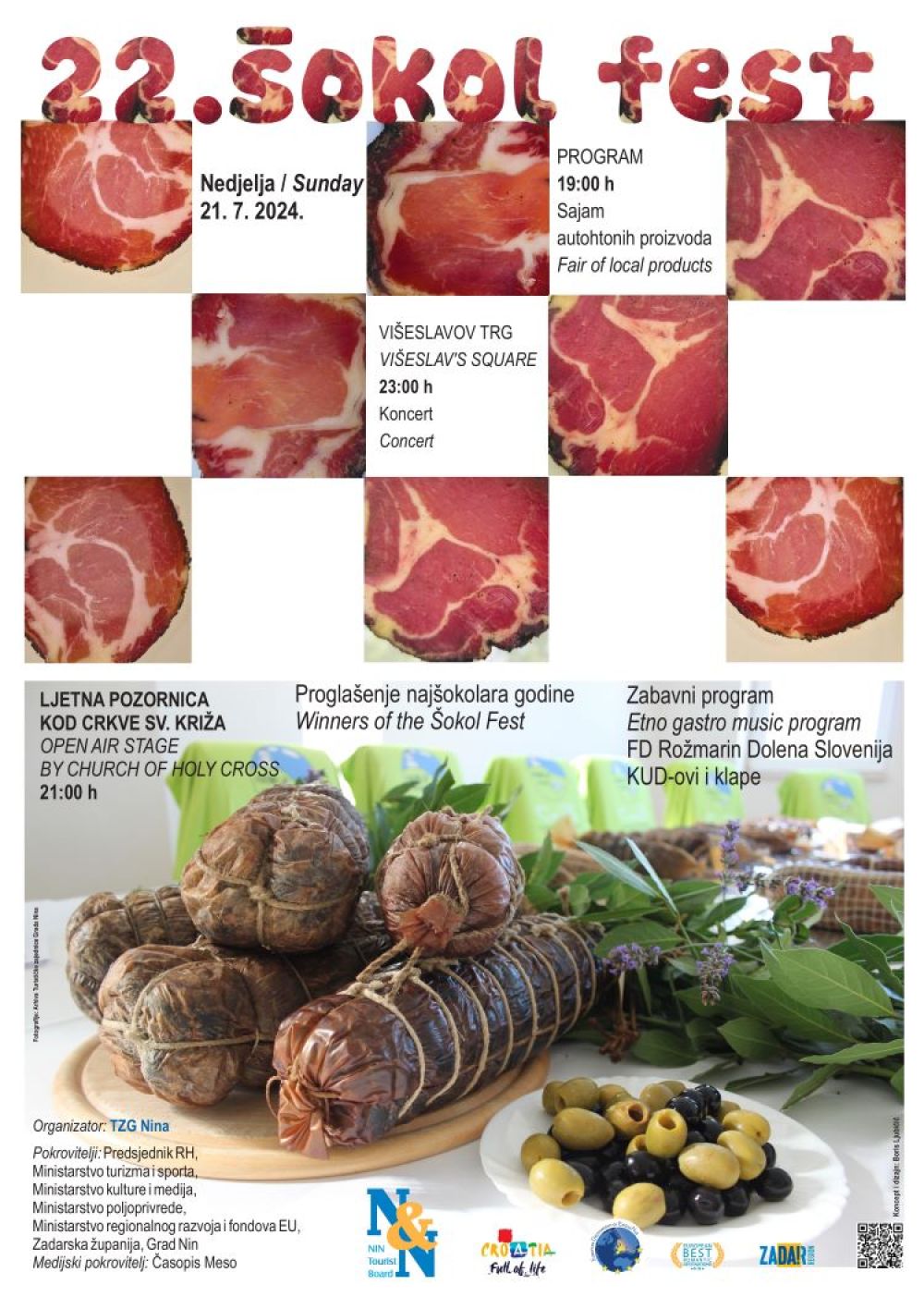 Ninska šokolijada jedinstvena je manifestacija koja započinje podjelom mesa natjecateljima – čuvarima baštine, u siječnju, a završava u srpnju kada se odabiru najbolji šokolari i priređuje gastronomska i sajamska fešta s eko i etno obilježjima te degustacijska priredba. Na Fešti od šokola sudjelovat će brojni izlagači iz regije, kontinenta i inozemstva. Tako će posjetitelji moći potražiti razne eko proizvode mnogih izlagača već od 19 sati na Višeslavovom trgu u Ninu, a imat će priliku i degustirati šokol.