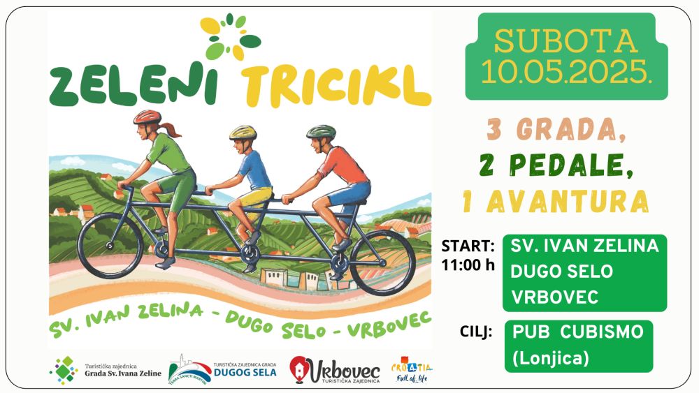 U subotu, 10. svibnja na području Dugog Sela, Sv. Ivana Zeline i Vrbovca, održat će se rekreativna biciklistička vožnja Zeleni tricikl – tri grada, dvije pedale, jedna avantura. Riječ je o zajedničkoj vožnji koja na dva kotača spaja tri susjedna grada, a završava velikim druženjem u cilju. Sudionici će moći odabrati jednu od tri startne točke — ŠRC Sv. Ivan Zelina, NK Vrbovec ili Martin breg u Dugom Selu, a cilj svih ruta je Pub Cubismo u Lonjici, gdje će ih dočekati zajedničko druženje uz glazbu, ukusne zaloge i dobru atmosferu.