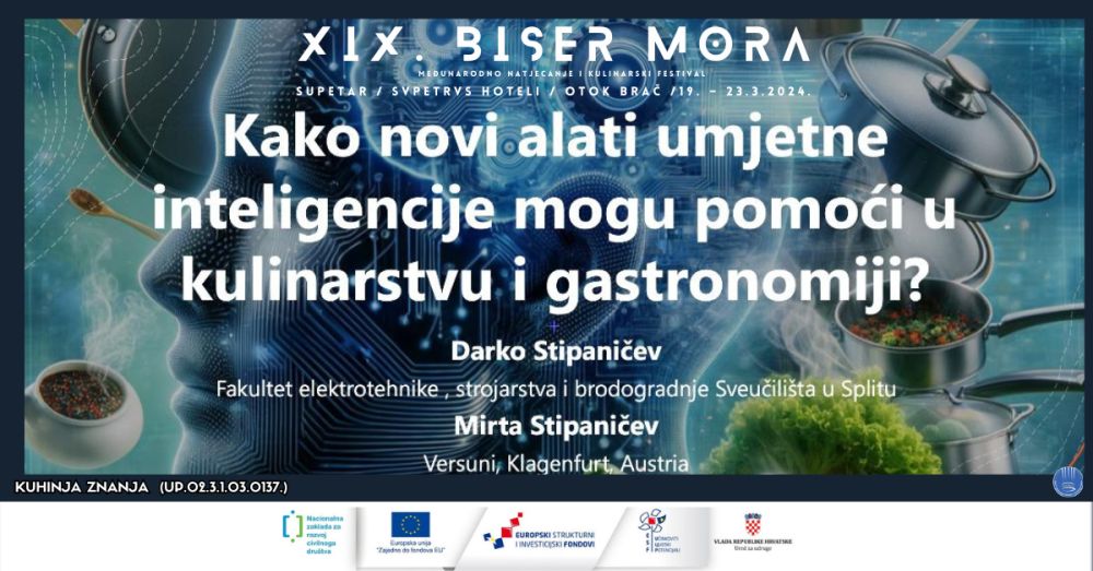 Predavanje i prezentacijsku radionicu na temu „Kako novi alati umjetne inteligencije mogu pomoći u kulinarstvu i gastronomiji?“ u četvrtak u 10. 30 sati (21. 3. 2024.), na ovogodišnjem Biseru mora u Supetru održat će Darko Stipaničev, profesor Fakulteta elektrotehnike, strojarstva i brodogradnje u Splitu, i Mirta Stipaničev, nutricionistica i voditeljica softverskih projekata tvrtke Versuni, Austria. Radi se o edukaciji koja će se na ovom najvećem kulinarskom festivalu i natjecanju u regiji dolazi kao dio EU projekta Kuhinja Znanja (UP.02.3.1.03.0137.) udruge Šefova kuhinja mediteranskih i europskih regija (ŠKMER) za jačanje društvenoga poduzetništva. Kroz radionicu upoznat će se današnje tehnike i praktični alati umjetne inteligencije, koji mogu poticajno i inovativno inspirirati kreativnost kuhara i gastronoma, pružiti im nove ideje, te unaprijediti ukupno iskustvo u planiranju pripreme hrane.