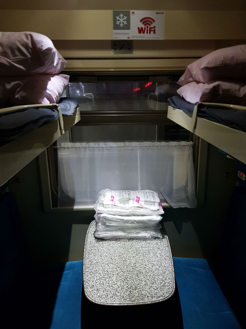 Ispred vagona 15. - dočekuju me ljubazne i svježe našminkane kondukterke. Tu je i prevoditeljica, u slučaju da nešto krene krivo. Ali sve je u redu, ta divanim ruski. Pokazujem svoju akreditaciju i putovnicu, sve se uredno provjeri da ne bih zalutao i službena procedura je gotova. Kako se radi o noćnom vlaku, moj je se ležaj nalazi u središnjem kupeu pod brojem 19. Kupe je ugodan, klimatiziran i s malim stolom te jednom utičnicom napona 220 V za punjenje mobilnih uređaja. Čeka me i komplet posteljine, pokrivač, deka, jastuk i ručnik. Opušteno sjedam na donji ležaj (od ukupno 4, dva gore i dva dolje).