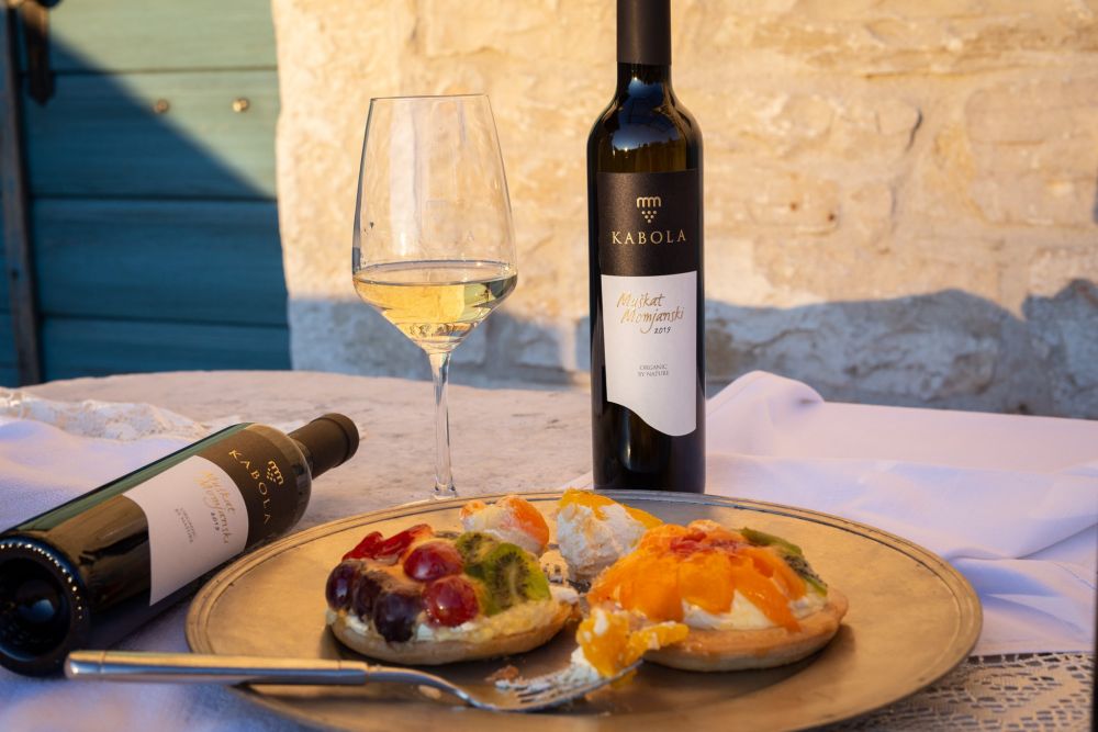 Slatki Kabolin Muškat Dolce od prosušenih bobica, jantarne je boje, intenzivnog okusa, punog tijela, sjajno uravnotežen. Otvara se aromom pečene dunje, slijede livadni med, suhe smokve i marelice pa ugodna nota karamele i najbolje je poslužiti ga uz čokoladni souffle ili tvrde sireve.