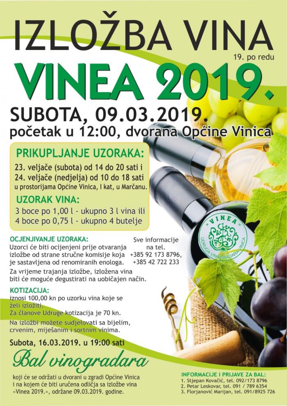 Organizatori 19. izložbe vina „Vinea 2019", Udruga vinogradara „Vinea“ Vinica te Općina Vinica pozivaju sve vinogradare i podrumare te sve zainteresirane na svečanost otvaranja izložbe koje će se održati u subotu, 9. ožujka s početkom u 12 sati u dvorani Općine Vinica. Stručno povjerenstvo sastavljeno od renomiranih enologa ovih dana obavlja odgovornu dužnost – ocjenjivanje uzoraka kojih je za ovogodišnju izložbu prikupljeno 330 iz cijele regije. Za vrijeme trajanja izložbe moći će se degustirati sva nagrađena i izložena vina.Zaslužena odličja organizatori će podijeliti vinogradarima na Vinskom balu koji će se održati u subotu, 16. ožujka godine s početkom u 19 sati .